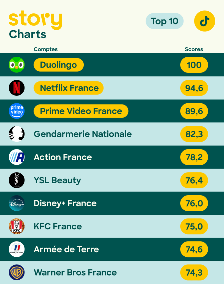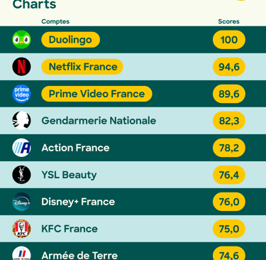 Sur TikTok, Duolingo se distingue en prenant la première place, démontrant l’impact croissant des plateformes vidéo sur les stratégies sociales des grandes marques. Elle est suivie par Netflix France et Prime Video France, qui réussissent à capter l’attention d’une audience dynamique grâce à des contenus originaux et adaptés aux codes de la plateforme.