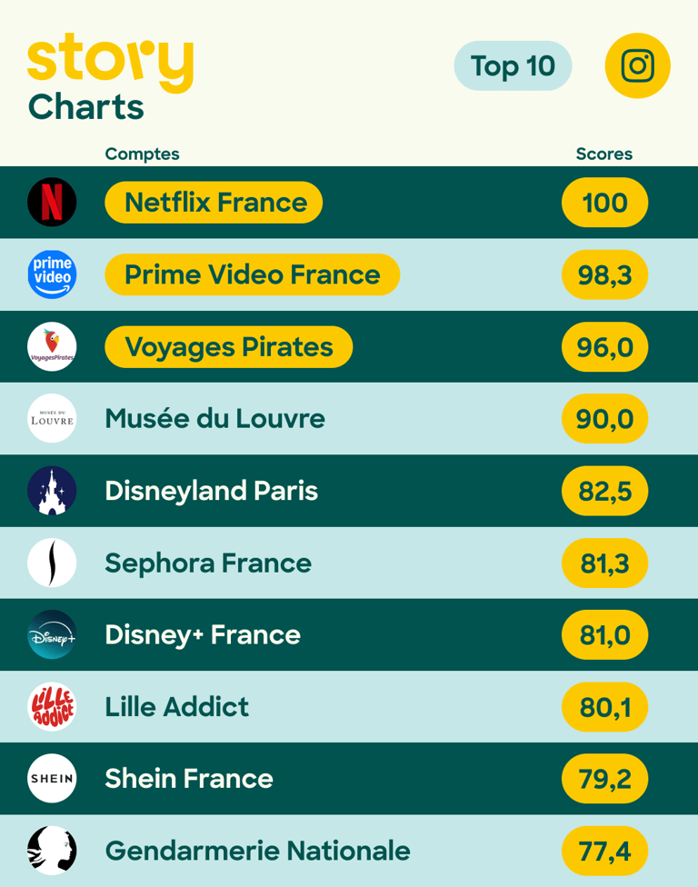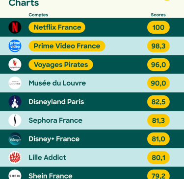 Pour la première fois, Instagram est intégré au classement, et Netflix y occupe la première place avec un score parfait de 100/100. La plateforme de streaming est suivie par Prime Video (Amazon) et Voyages Pirates. Le taux d’interaction moyen sur Instagram pour ce trimestre atteint 8,33 %, surpassant largement ceux de YouTube (0,38 %) et TikTok (3,32 %), ce qui souligne la capacité de la plateforme à favoriser l’engagement direct.