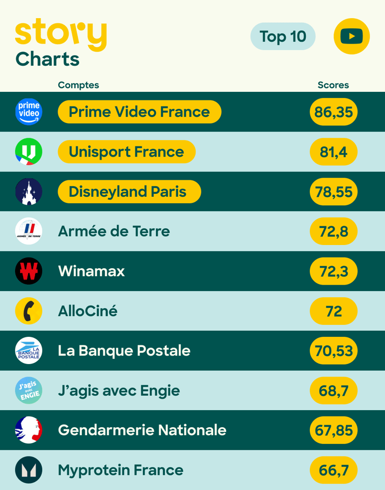 Prime Video France arrive en tête sur YouTube avec une note de 86,35, suivie de près par Unisport France et Disneyland Paris. Malgré un taux d’interaction moyen plus faible (0,38 %), ces marques parviennent à générer des résultats significatifs, notamment en termes de vues, avec un taux moyen d’évolution des vues de +421 %. Certaines marques, comme Caradisiac, se distinguent par leur capacité à fidéliser une communauté de passionnés grâce à des contenus informatifs, tandis que d’autres, comme Metro France, mettent en avant des concepts originaux et interactifs.